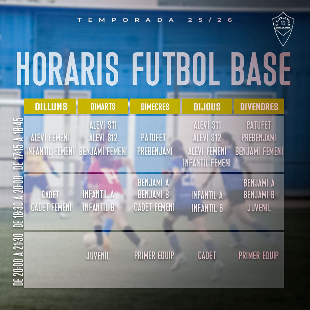 ⏱️🗓️ FRANGES HORÀRIES FUTBOL BASE Us presentem les franges horàries i els dies d’entrenament dels diferents equips de la base. Som-hi Atlètics!🔵